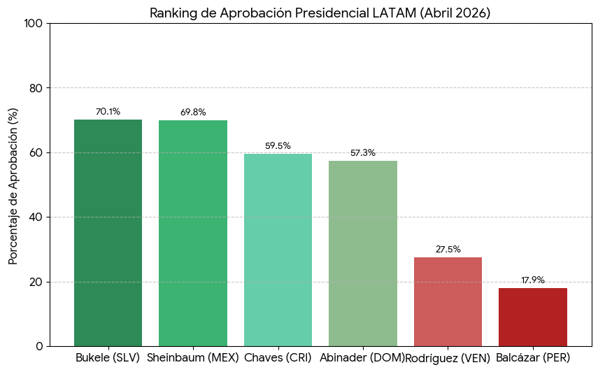 Nayib Bukele, Claudia Sheinbaum y Rodrigo Chaves se consolidan al cierre de abril como los mandatarios con mayor respaldo popular en Latinoamérica, de acuerdo con el último sondeo de CB Consultora Opinión Pública. Con un 70,1% de aprobación, Bukele lidera la tabla sustentado en su política de seguridad, seguido de cerca por Sheinbaum, quien mantiene un 69,8% de imagen positiva en su primer semestre de gestión en México.